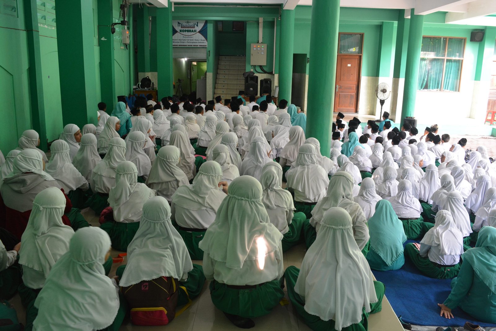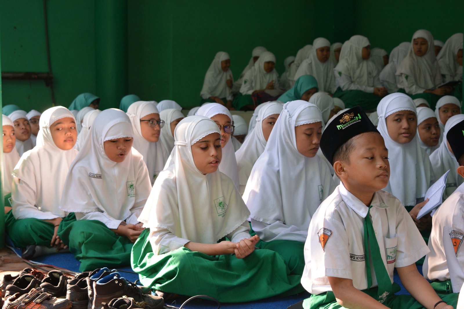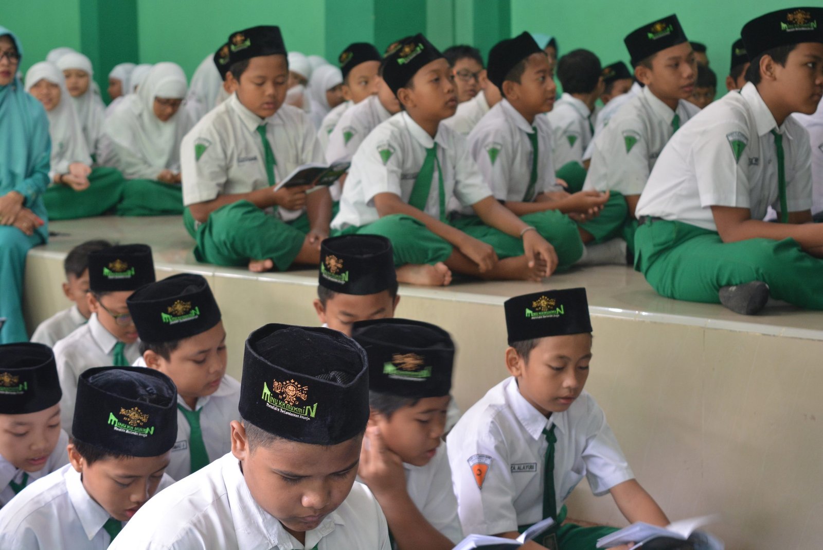 Dalam rangka hari lahir (Harlah) ke-96 Nahdlatul Ulama, siswa-siswi MINU K.H. Mukmin Sidoarjo membaca istighosah, tahlil, dan shalawat asyghil bersama yang diselenggarakan di halaman madrasah. Senin, 25 Maret 2019.